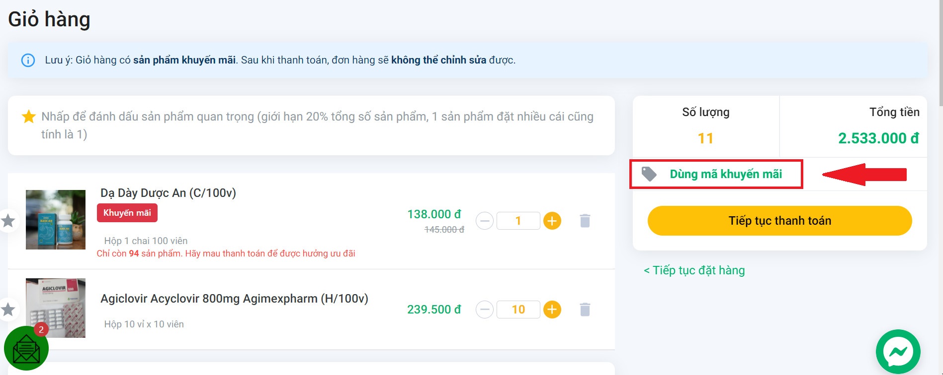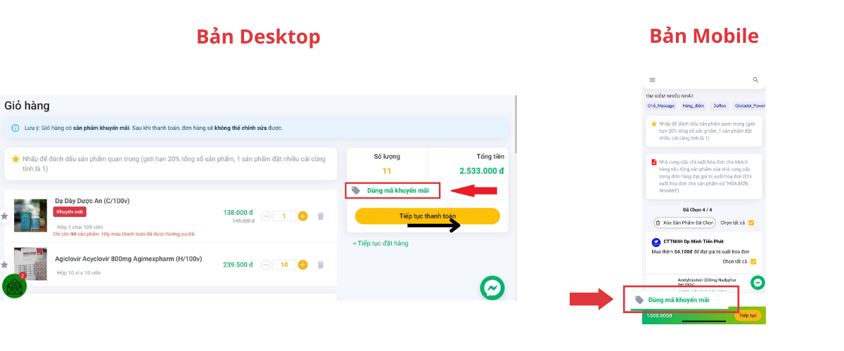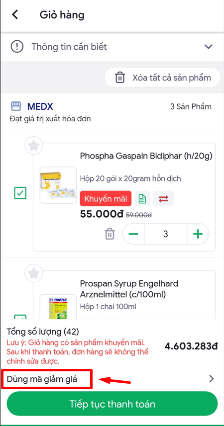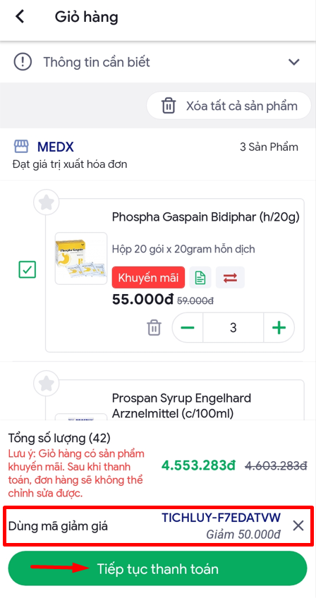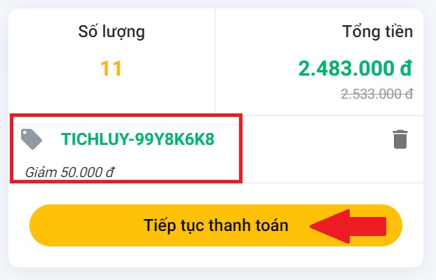Bước 3: Hệ thống sẽ tự động áp dụng giảm giá, bấm chọn Tiếp Tục Thanh Toán để hoàn tất đơn hàng