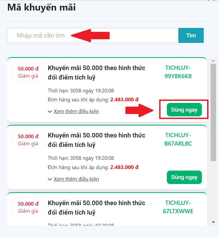 Bước 2: Hệ thống sẽ hiển thị các mã giảm giá có thể sử dụng. Lướt xuống để tìm mã giảm giá thích hợp và chọn Dùng Ngay