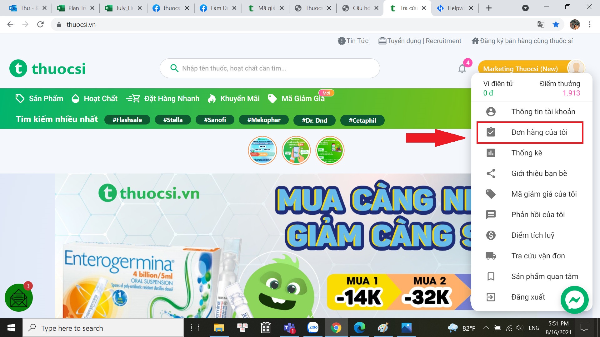 Bước 1: Đăng nhập vào thuocsi.vn và chọn ĐƠN HÀNG CỦA TÔI